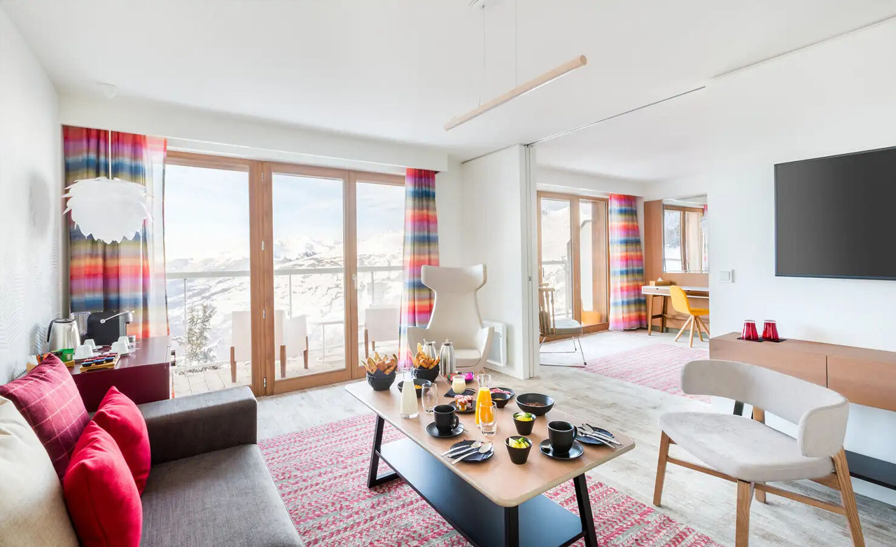 Mit Panoramablick: Diese Suite lässt keine Wünsche offen: Von Ihrem Wohnzimmer aus genießen Sie weite Blicke über das Tal der Tarentaise und der möblierte Balkon sowie zwei Schlafzimmer laden zum Entspannen ein. Das hochwertige und geschmackvolle Design ist bis ins kleinste Detail erkennbar.