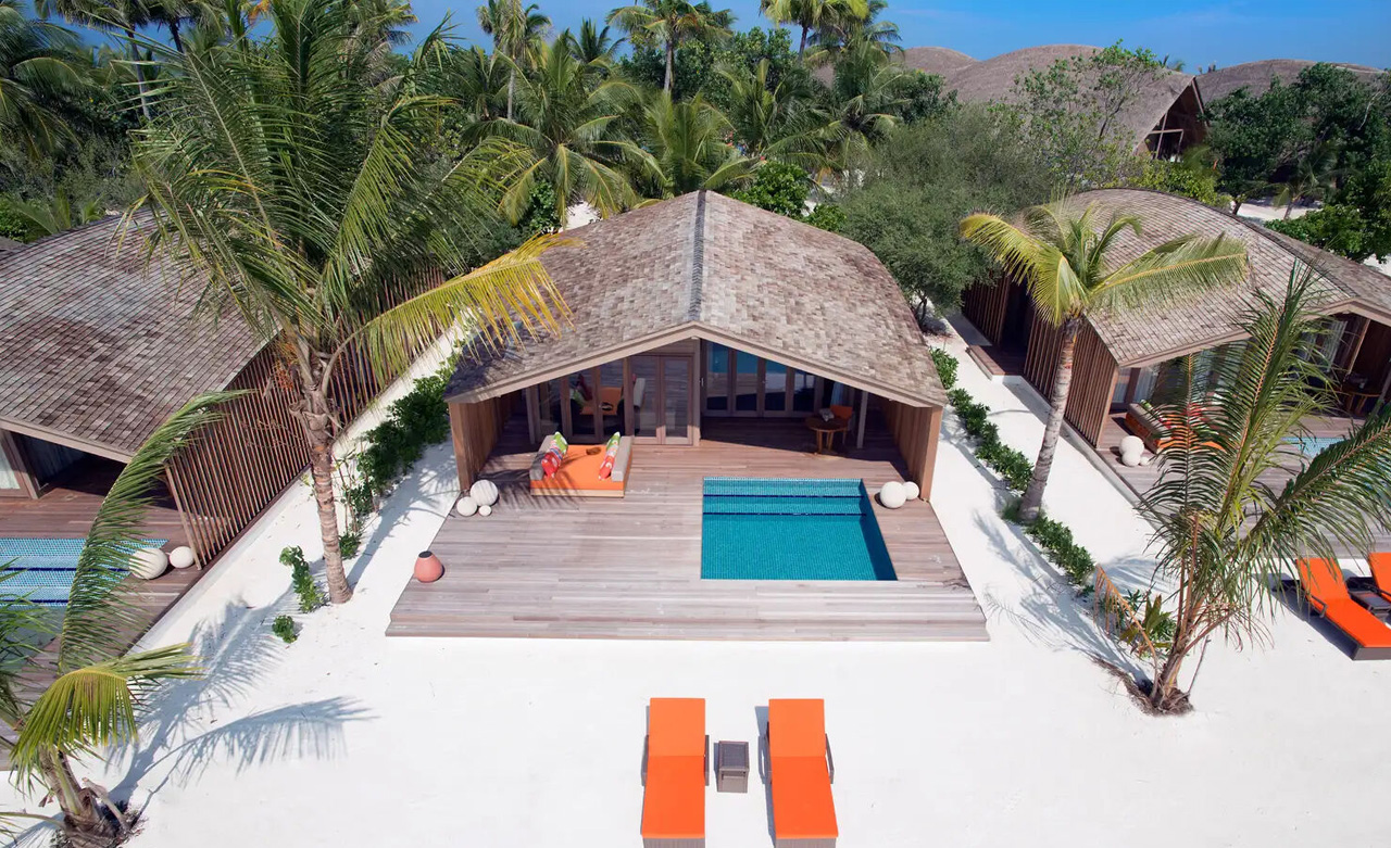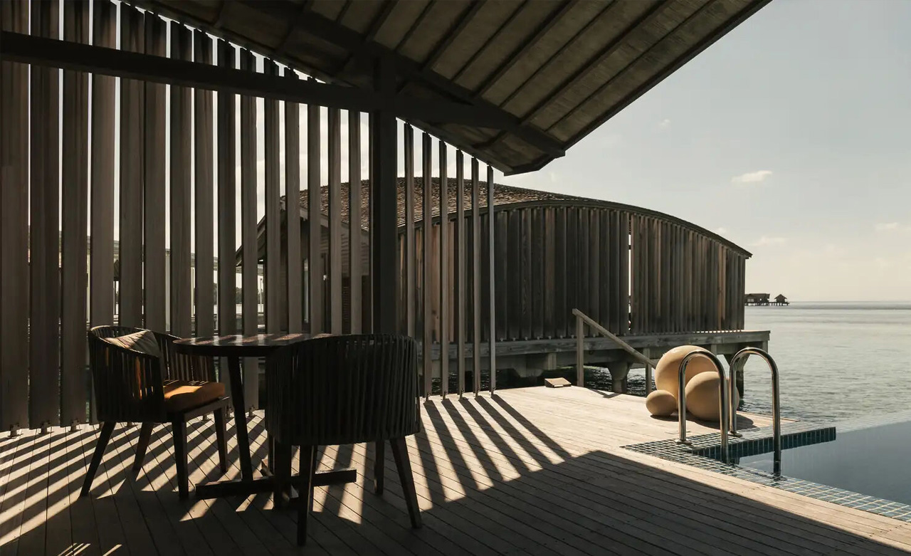Die modern und hell gestaltete Villa verfügt über eine große Holzterrasse mit Pool und Sonnenliegen. Im kristallklaren Meer unter Ihnen spielen Clownfische, Schildkröten und Rochen.