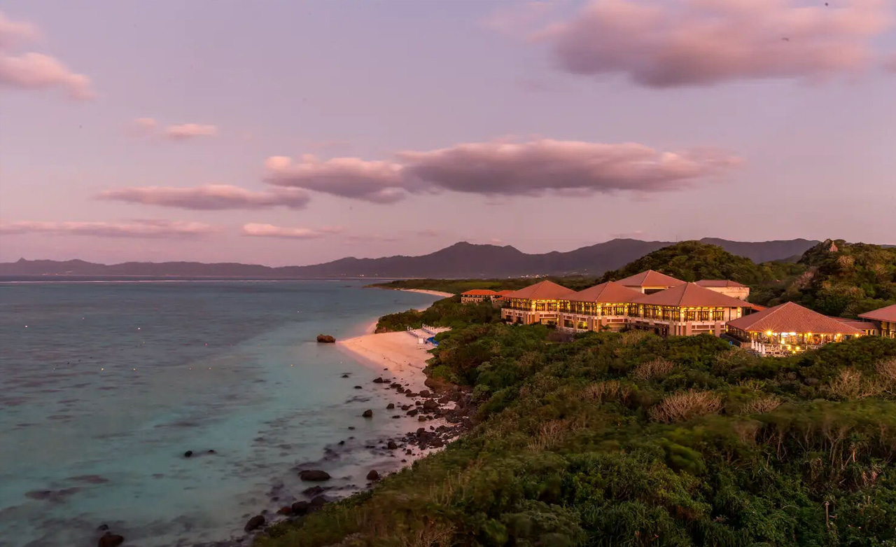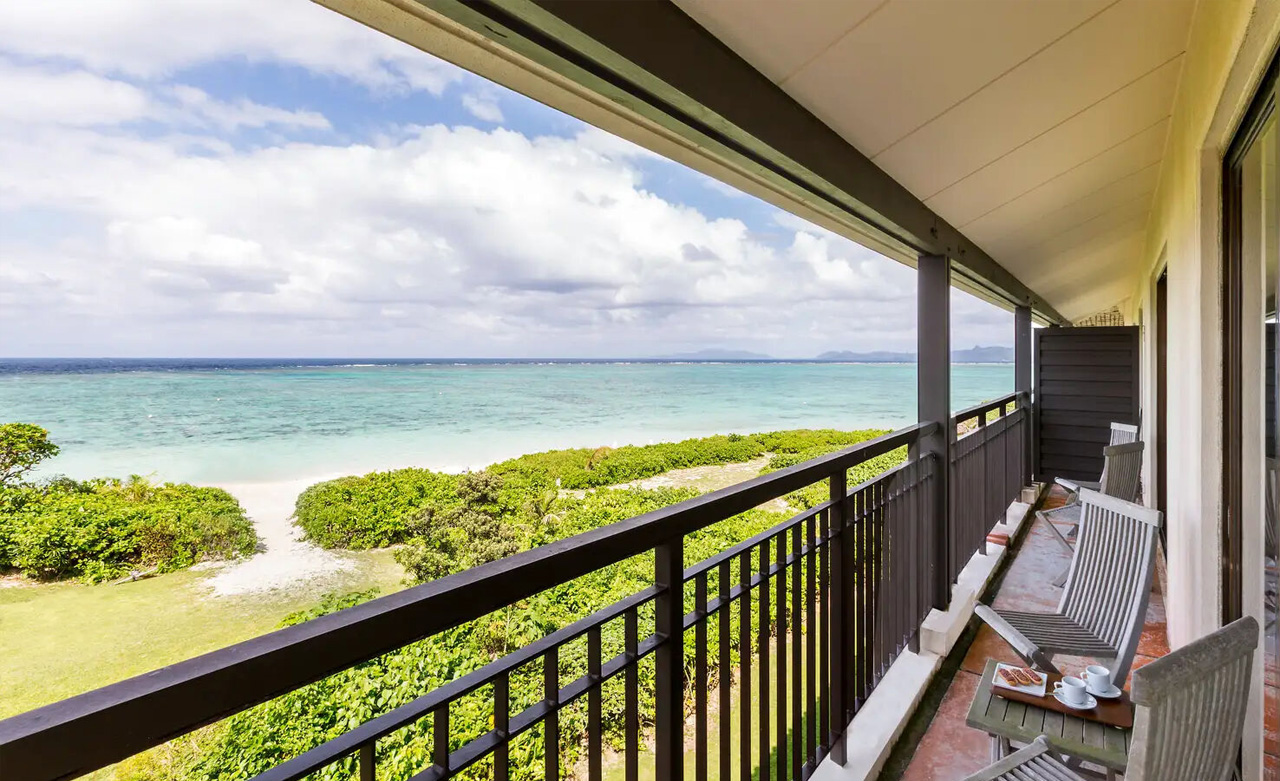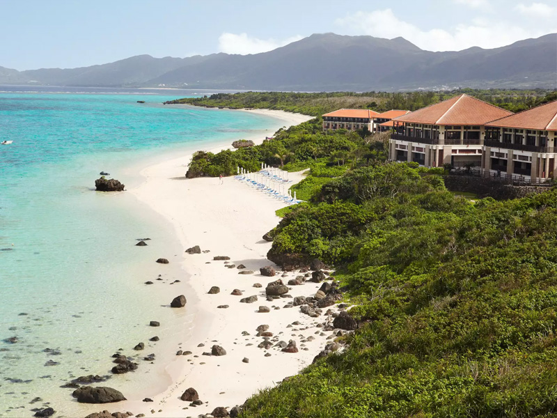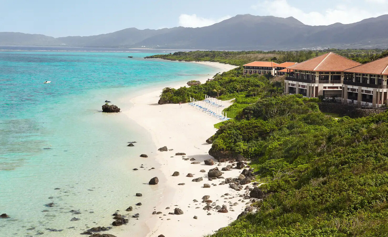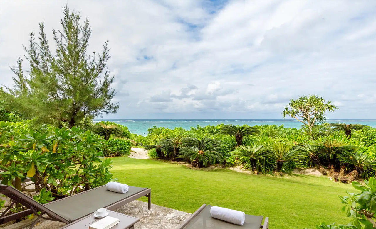 Zwischen tropischem Wald und weißem Sand liegen die Zimmer, die die Farben des ostchinesischen Meeres widerspiegeln. Holzbalkone und schräge Ziegeldächer vervollständigen das okinawanische Design, das in jedem Zimmer zu erleben ist.