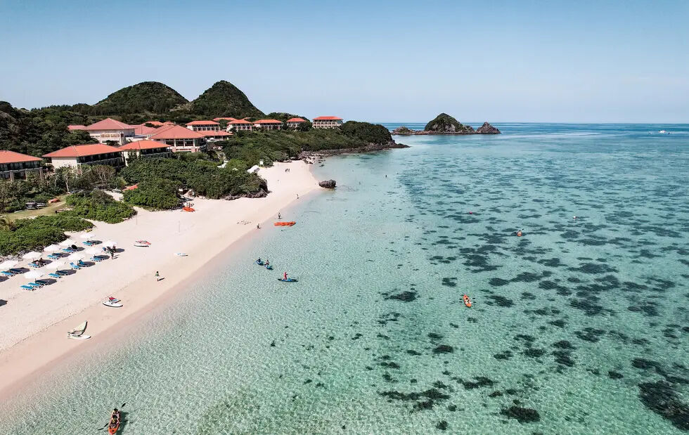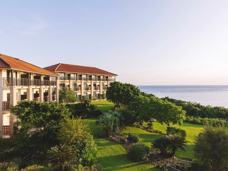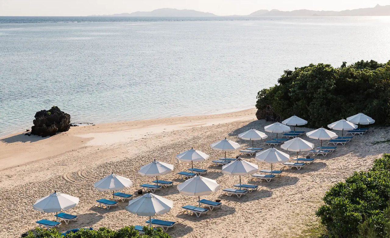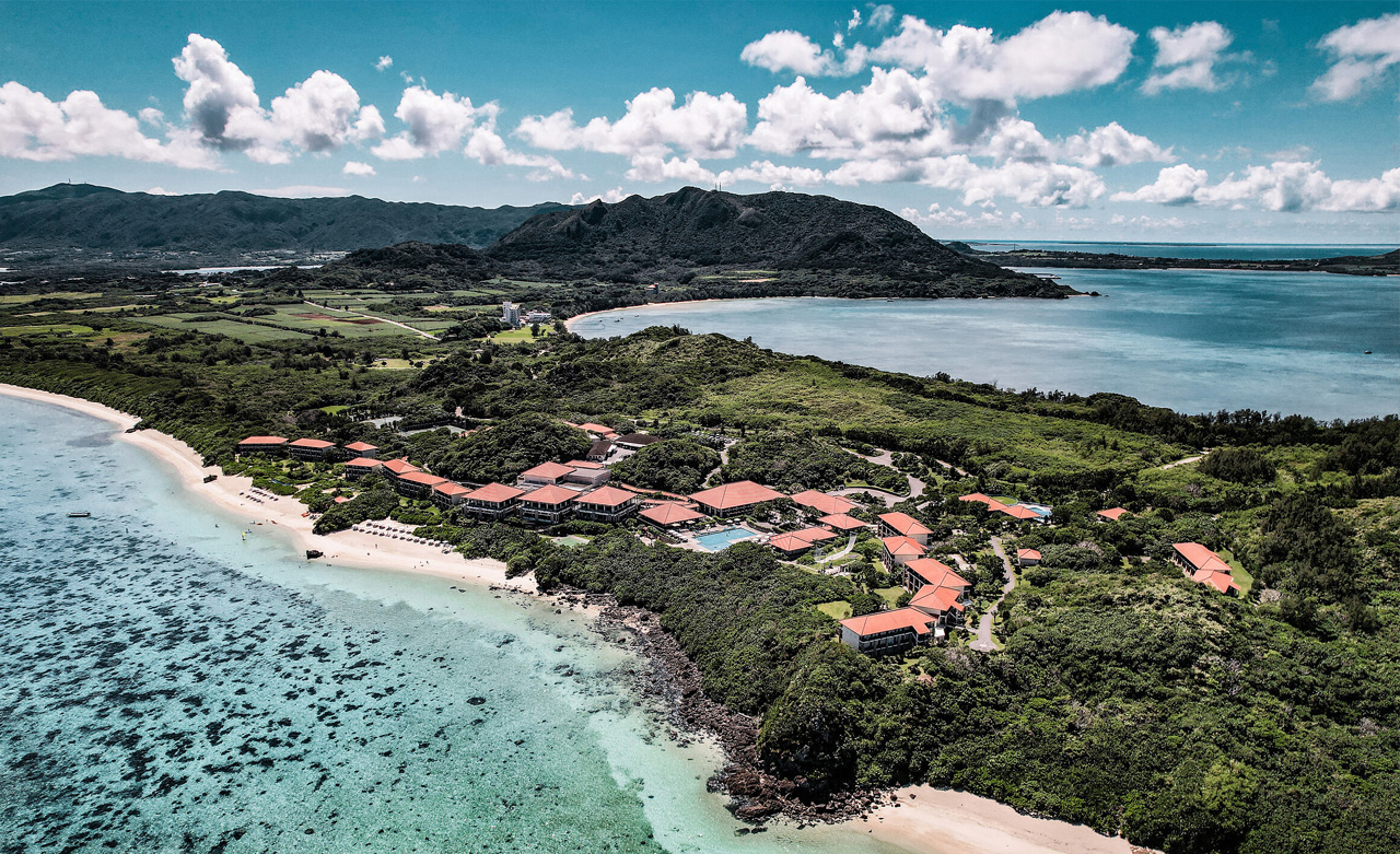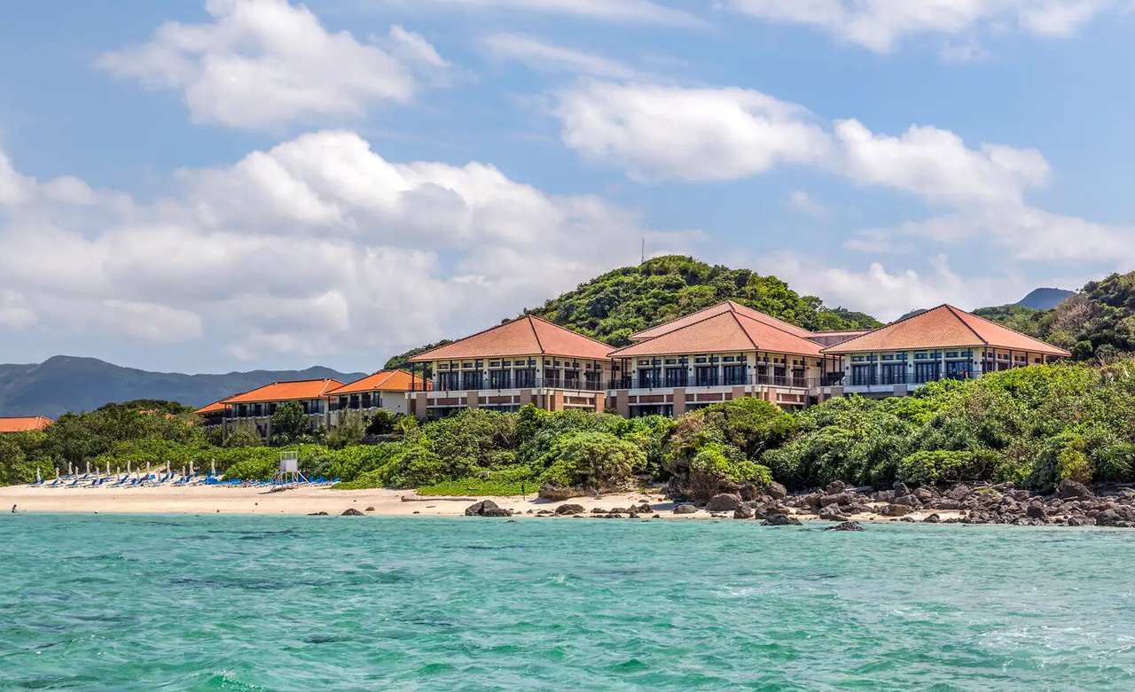 Zwischen tropischem Wald und weißem Sand liegen die Zimmer, die die Farben des ostchinesischen Meeres widerspiegeln. Holzbalkone und schräge Ziegeldächer vervollständigen das okinawanische Design, das in jedem Zimmer zu erleben ist.