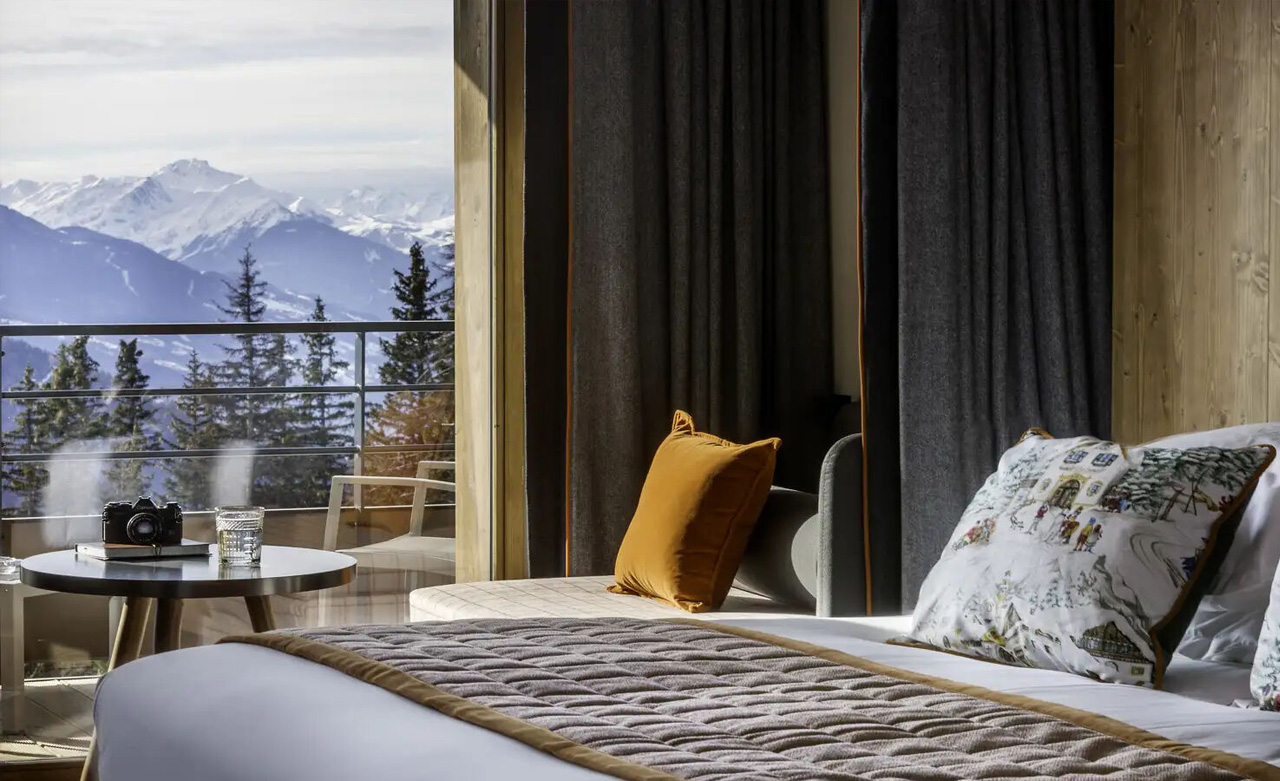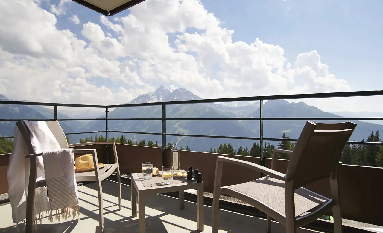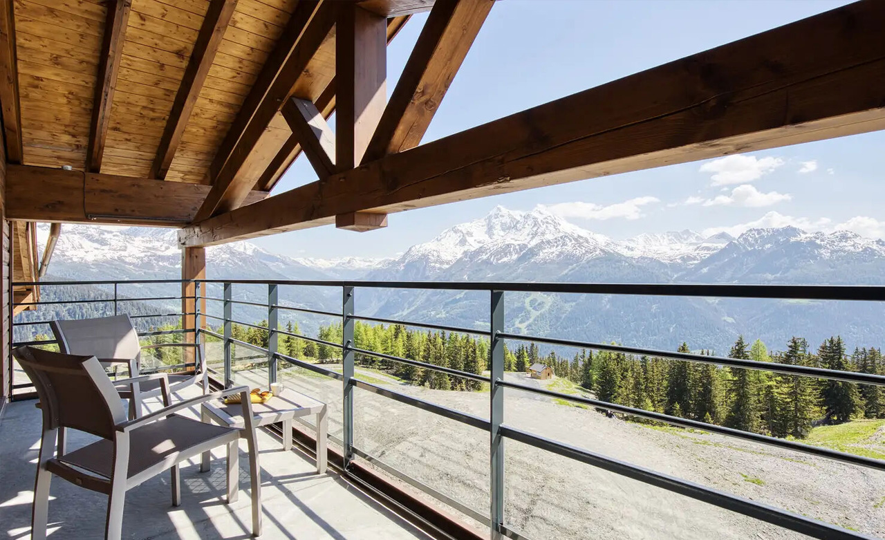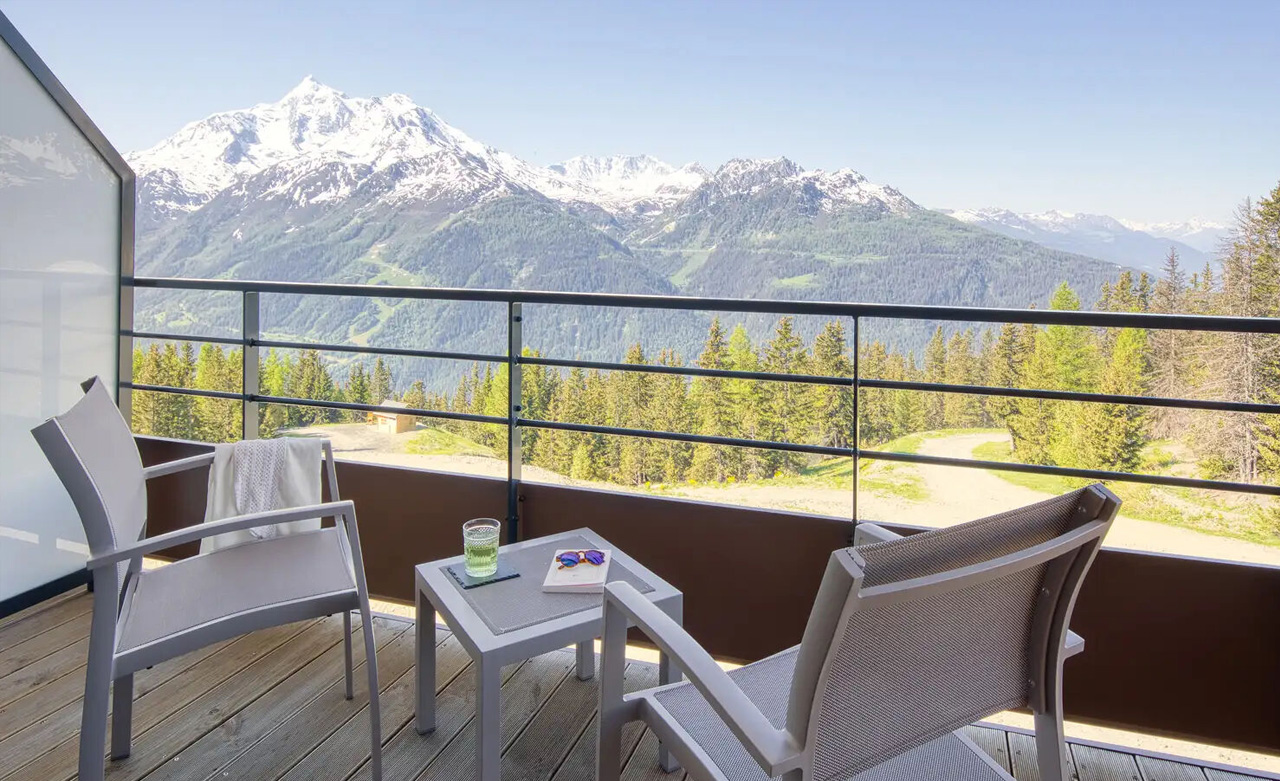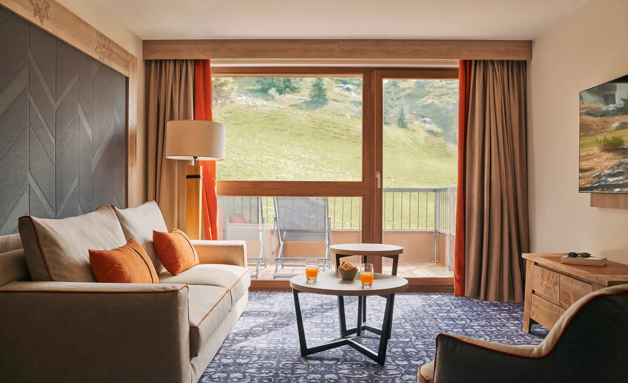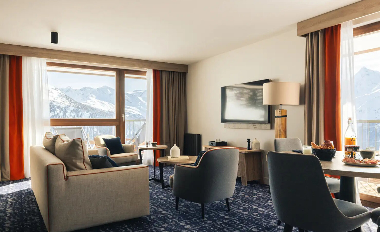 Mit Aussicht: Der Balkon dieser Junior-Suite bietet einen außergewöhnlichen Blick auf das Tarentaise-Tal und ist dessen Herzstück. Mit 2 Schlafzimmern, einem Wohnzimmer und 2 Bädern strahlt dieser überaus geräumige Raum Gemütlichkeit aus und verbindet Tradition und Moderne.