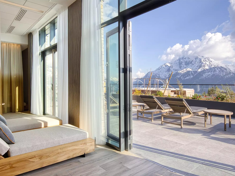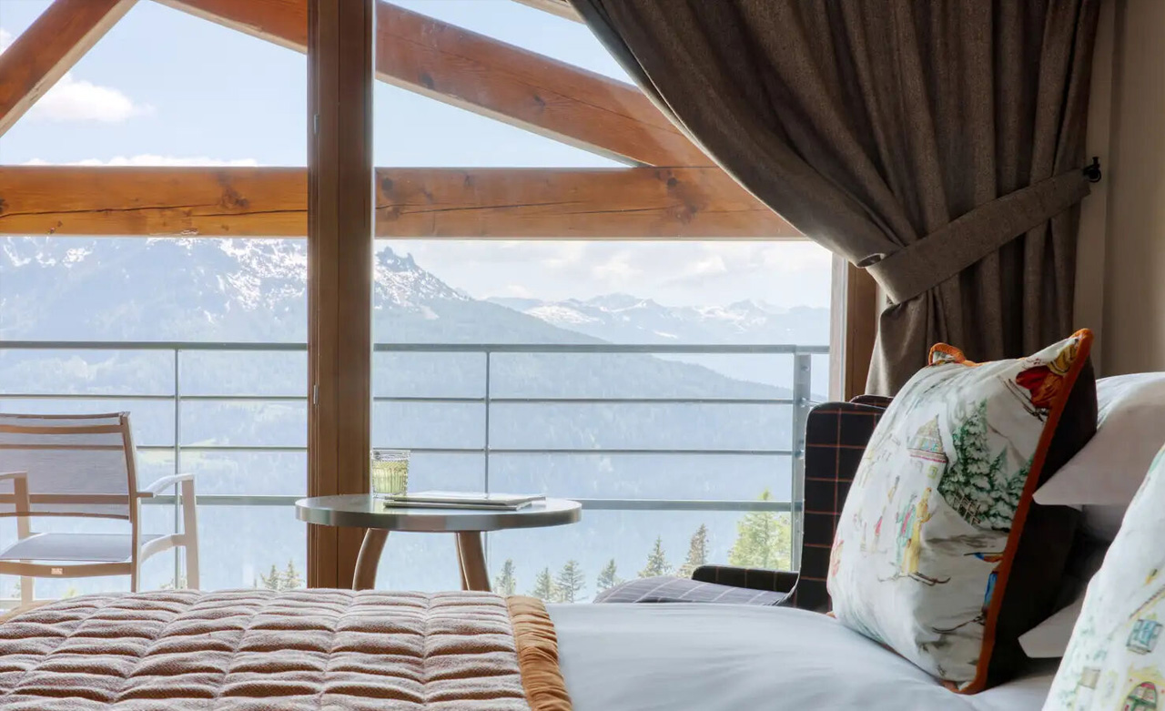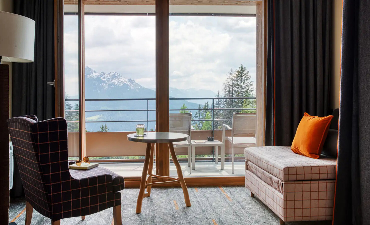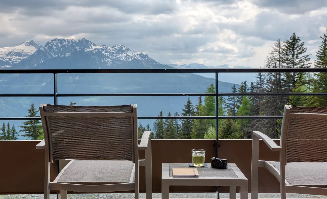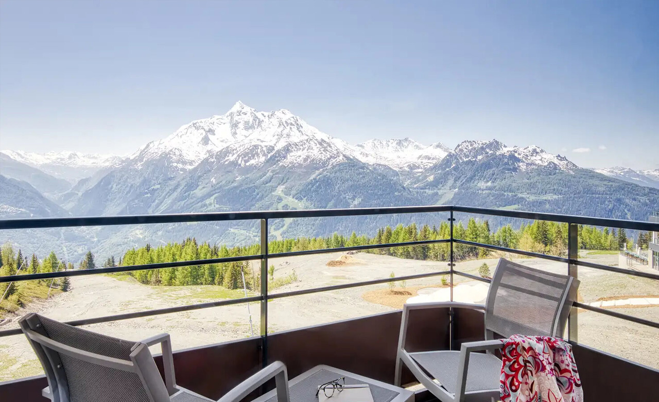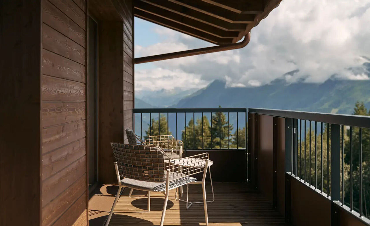 Mit Aussicht: Der Balkon dieser Junior-Suite bietet einen außergewöhnlichen Blick auf das Tarentaise-Tal und ist dessen Herzstück. Mit 2 Schlafzimmern, einem Wohnzimmer und 2 Bädern strahlt dieser überaus geräumige Raum Gemütlichkeit aus und verbindet Tradition und Moderne.