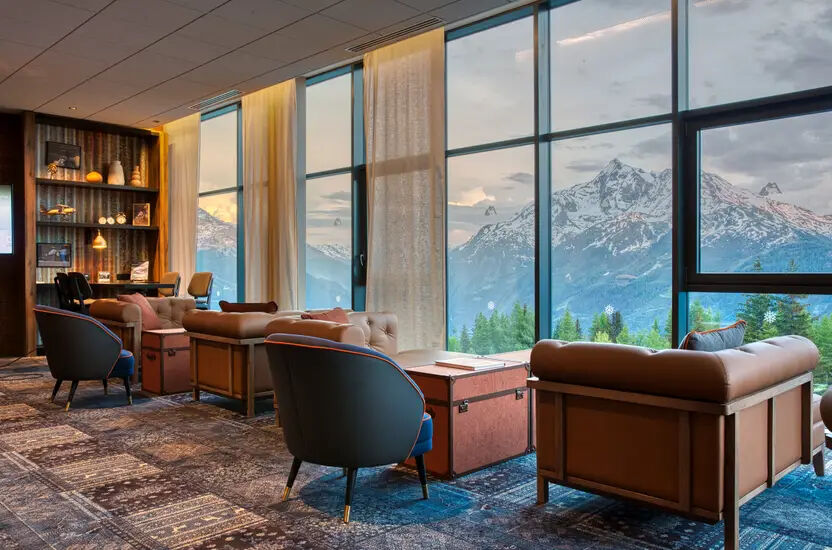 Die Zen-Lounge lädt zur ruhigen Betrachtung des Berges in all seiner Schönheit ein. Lassen Sie sich ein in den Komfort eines gemütlichen Chesterfield-Sofas mit einem Kaffee oder einer lokalen Kräutertee, während Sie sich am Kamin in diesem friedlichen Rückzugsort entspannen.