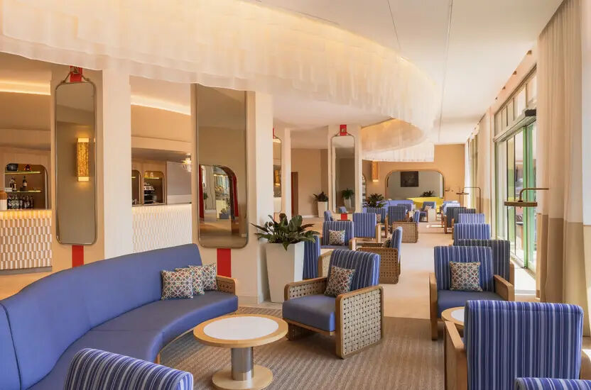 einladende Atmosphäre. Das blau-orangefarbene Dekor erinnert an eine Seereise.