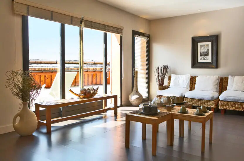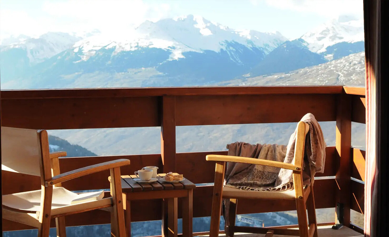 Blicken Sie von Ihrem Balkon auf die Berge oder das Tal. Ihr Zimmer hat eine eigene Lounge, in der Sie sich entspannen können. Die Grau- und Rottöne in Kombination mit dem Holz schaffen eine angenehme Atmosphäre.