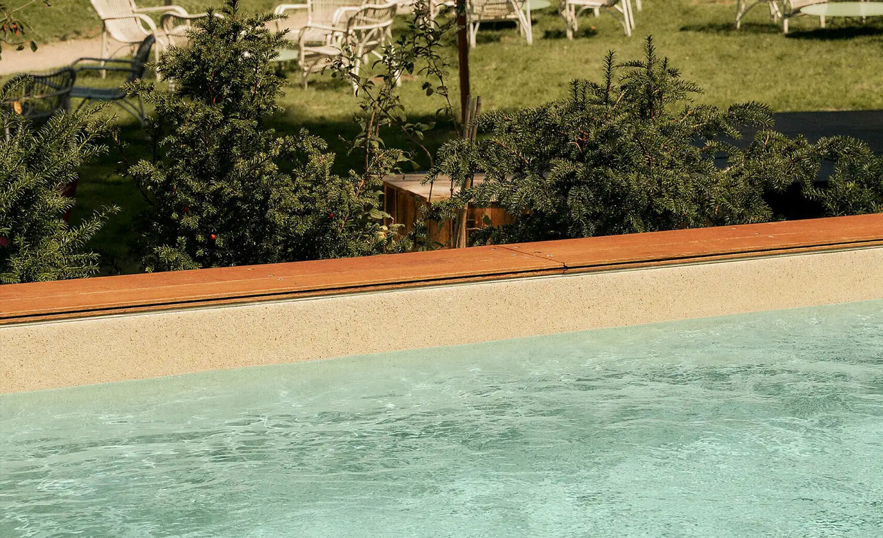 Außenpool und einer Holzterrasse, auf der man sich sonnen und die umliegende