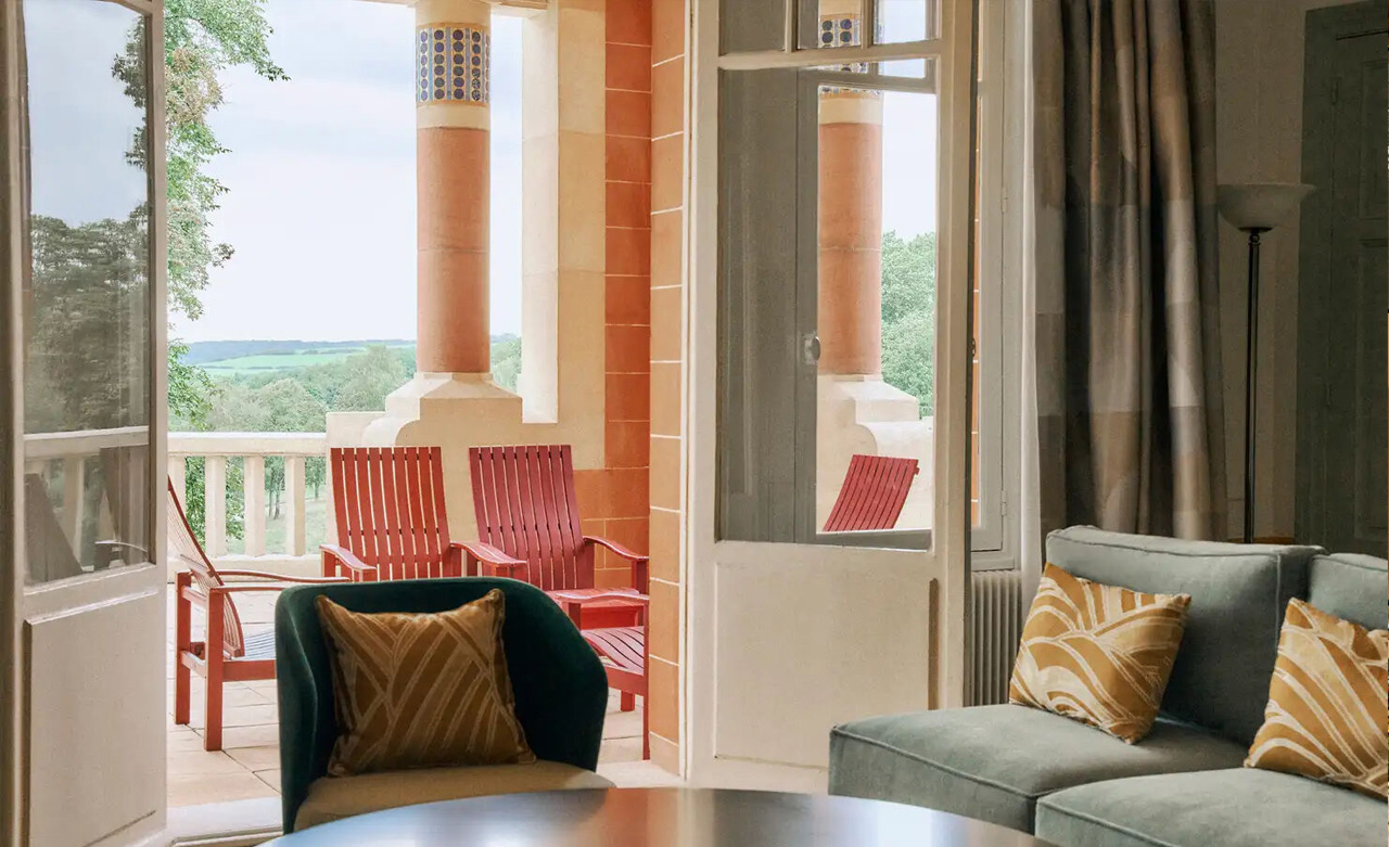 Der gemütliche Art-Deco-Wohnbereich öffnet sich zum Balkon mit herrlichem Blick