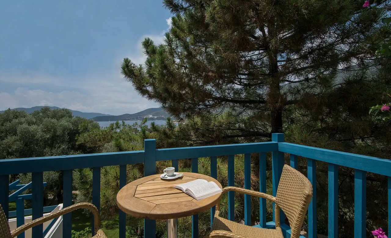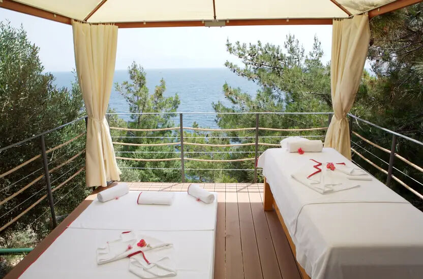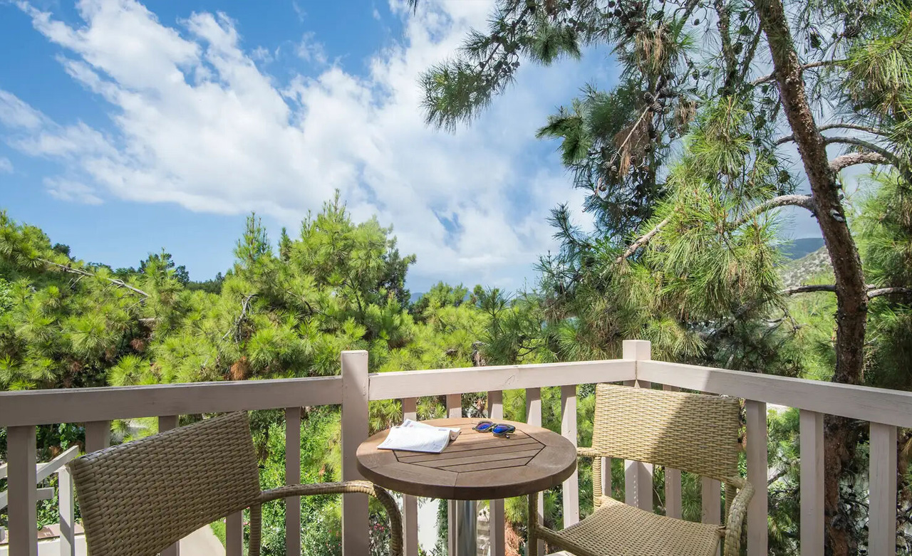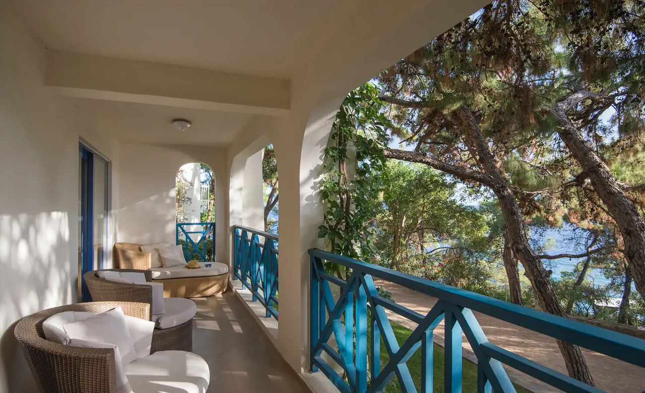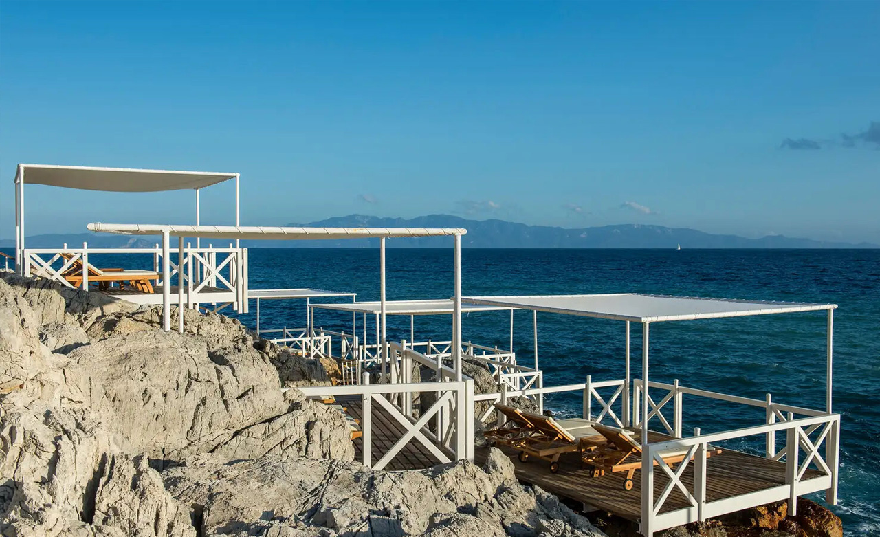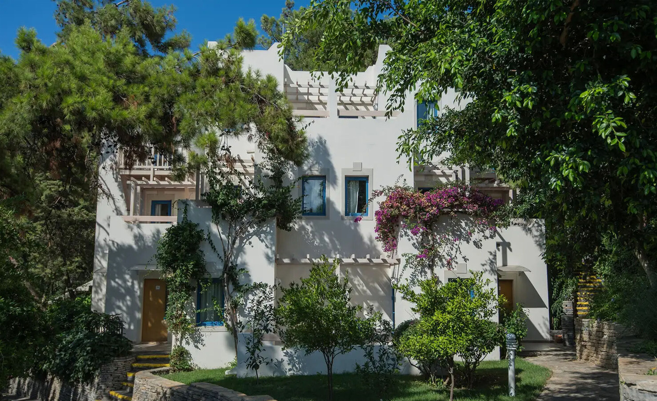 An den Ufern des Ägäischen Meeres finden sich strahlend weiße Bungalows zwischen Pinien, Palmen und blumengeschmückten Wegen. Die moderne und elegante Innenausstattung bietet eine luxuriöse Auszeit im Grünen.