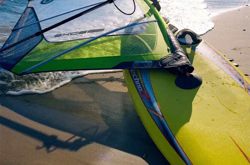 Windsurfen und Kitesurfen. Stellen Sie sich auf das Windsurfbrett, schnappen Sie
